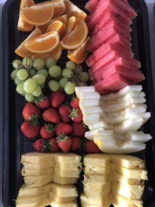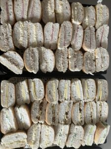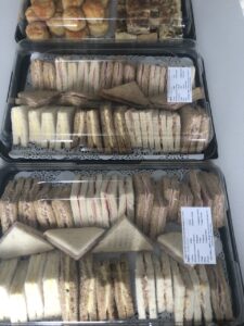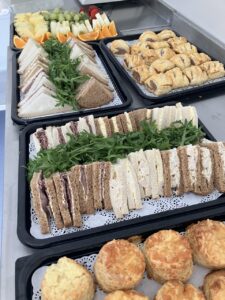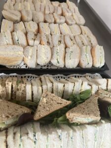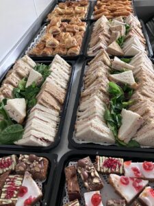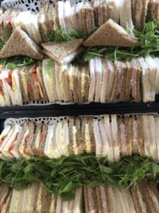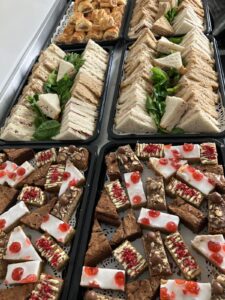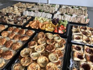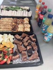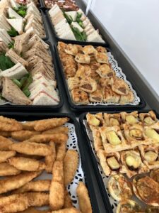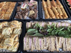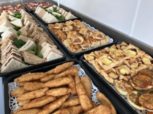 Coleslaw (homemade) – Crisps – Fruit platter – Pasta salad (homemade, pesto and mozzarella) – Potato salad (homemade) – Mixed leaf salad – Vegetable sticks and dips