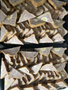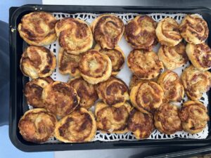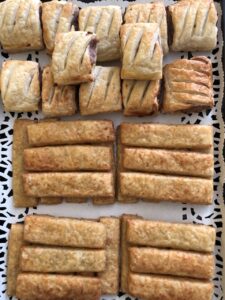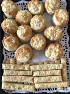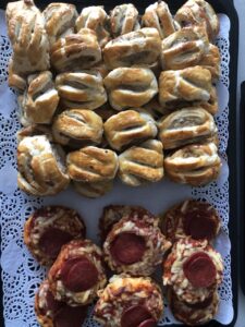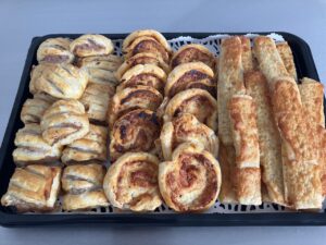 Brie and cranberry bites – Cheddar cheese and broccoli quiche – Cheese and bacon quiche – Cheese and chive muffins – Cheese and onion roll – Cheese and potato pasty – Cheese and tomato quiche – Cheese scone – Cheese straw – Cheesy garlic pizza – Chicken goujons – Cocktail sausages – Gala pie slices – Goats cheese and red onion tarts – Honey and mustard sticky sausages – Mini horseradish and beef Yorkshire puddings – Mini quiche – Pesto and parmesan pinwheels – Pizza – Pizza pinwheels – Pork pie slices – Sausage rolls